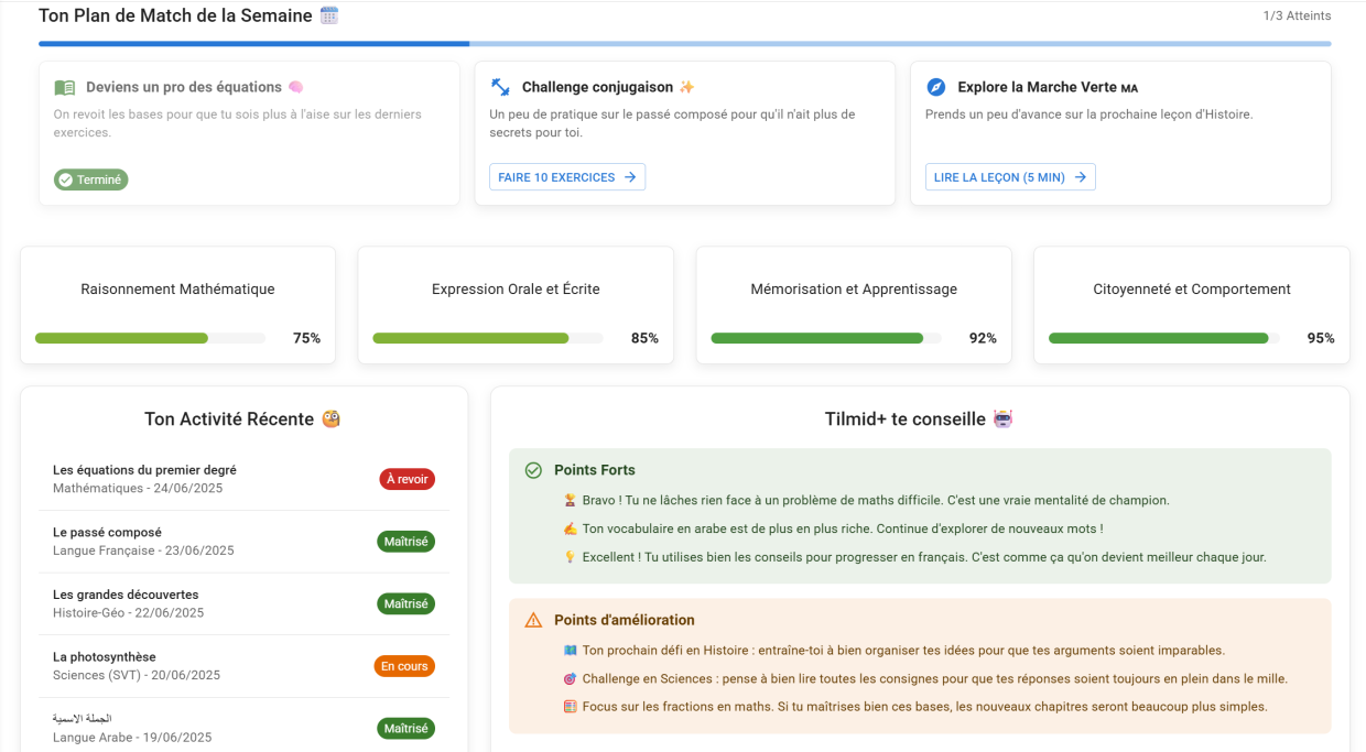 Au cœur de TilmiCode se trouve Tilmid+, une intelligence artificielle agentique conçue pour accompagner l’élève au quotidien dans le programme scolaire officiel. Elle offre un soutien complet pour maîtriser chaque matière.